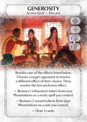 At the time I first wrote this article the secrets of Generosity were just getting revealed. After putting time in with the single cost spell it has to be crowned the all time best draw card outside of a phoenixborn. One die for three cards cannot be beat.