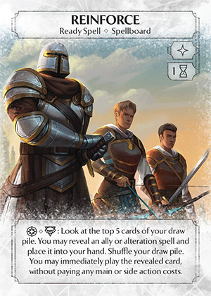 Reinforce is an amazing tutor/sifting hybrid card in almost every other card game. Even on its surface spending one die to tutor five cards deep for a card is really good for combo decks. But, not beneficial for Ashes. It certainly reads on paper like a ready spell that summons semi random units. I believe the only thing holding this card back is tempo cost.